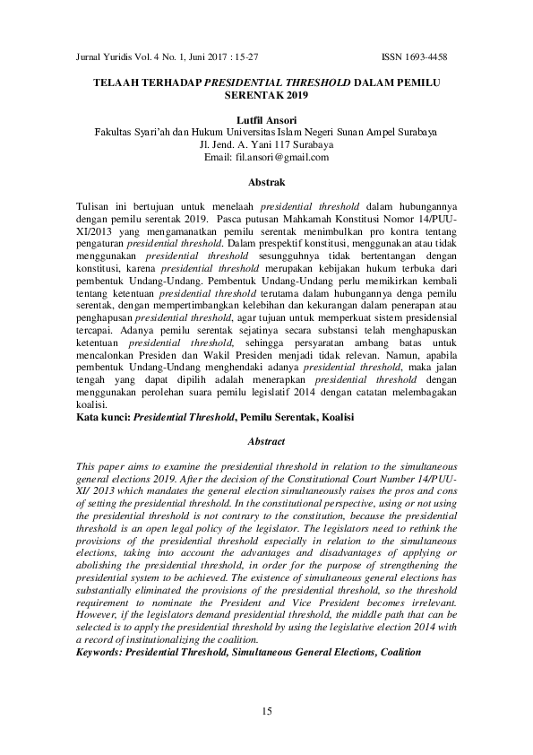 Download Pdf Telaah Terhadap Presidential Threshold Dalam Pemilu Serentak 2019 Lutfil Ansori Academia Edu HD