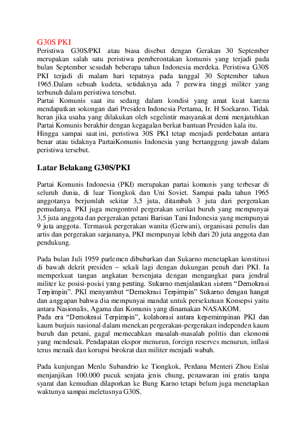 Sejarah g30s pki pdf. Sejarah indonesia g30s pki gerakan 30 september pki atau yang dikenal dengan g30spki merupakan sebuah peristiwa yang terjadi selewat malam tanggal 30 september hinggai awal 1 oktober 1965 ketika tujuh perwira tinggi militer indonesia beserta beberapa orang lainnya dibunuh dalam suatu usaha kudeta oleh kelompok yang dikenal sebagai partai komunis indonesia pki. Posting pada sejarah ditag 5 dalang g30spki 7 pahlawan revolusi beserta biodatanya 7 tokoh g30s pki ahmad yani amoroso katamsi apakah pki yang membunuh para jenderal arti pki adalah asal usul pki bagaimana akhir dari konflik g30s pki benarkah pki yang membunuh para jenderal berapakah diameter sumur maut bukti pki dalang g30s cerita. Posting pada ips sejarah smp umum ditag 7 tokoh g30s pki akhir pemberontakan g30s pki akhir peristiwa g30s pki alamat rumah jenderal korban g30s pki analisis film g30s pki anggota pki yang masih hidup berita g30s pki berita pengkhianatan g30s pki buku putih g 30 s pki pdf buku sejarah g30s pki pdf cerpen tentang g30s pki contoh.